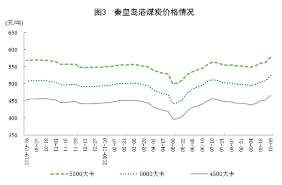 港口煤炭综合交易价格上涨。10月9日,秦皇岛港5500大卡、5000大卡和4500大卡煤炭价格分别为每吨578元、524元和466元,比9月4日分别上涨29元、29元和27元。