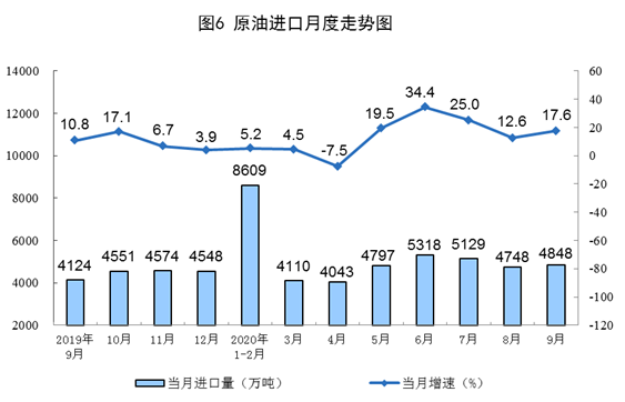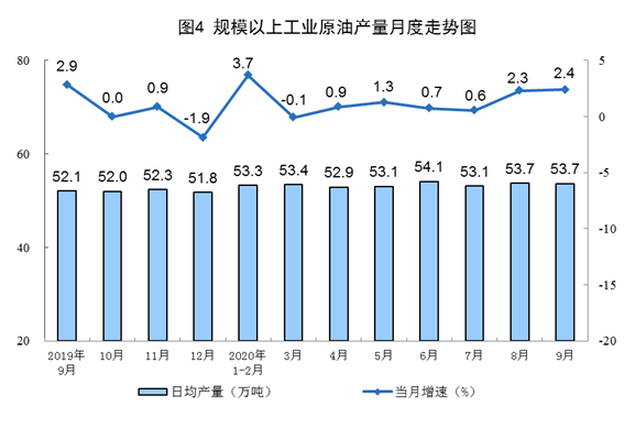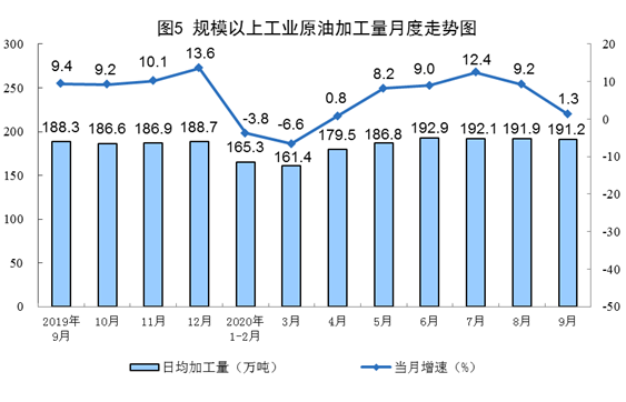 原油生产平稳,加工增速回落。9月份,生产原油1610万吨,同比增长2.4%,增速比上月加快0.1个百分点;加工原油5735万吨,增长1.3%,比上月回落7.9个百分点。1—9月份,生产原油14625万吨,同比增长1.7%;加工原油5.0亿吨,同比增长2.9%。