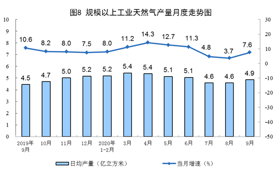 天然气生产加快。9月份,生产天然气146亿立方米,同比增长7.6%,增速比上月加快3.9个百分点;日均产量4.9亿立方米,环比增加0.3亿立方米。1—9月份,生产天然气1371亿立方米,同比增长8.7%。
