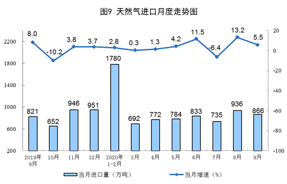 天然气进口增速回落。9月份,进口天然气866万吨,同比增长5.5%,增速比上月回落7.7个百分点。1—9月份,进口天然气7373万吨,同比增长3.7%。