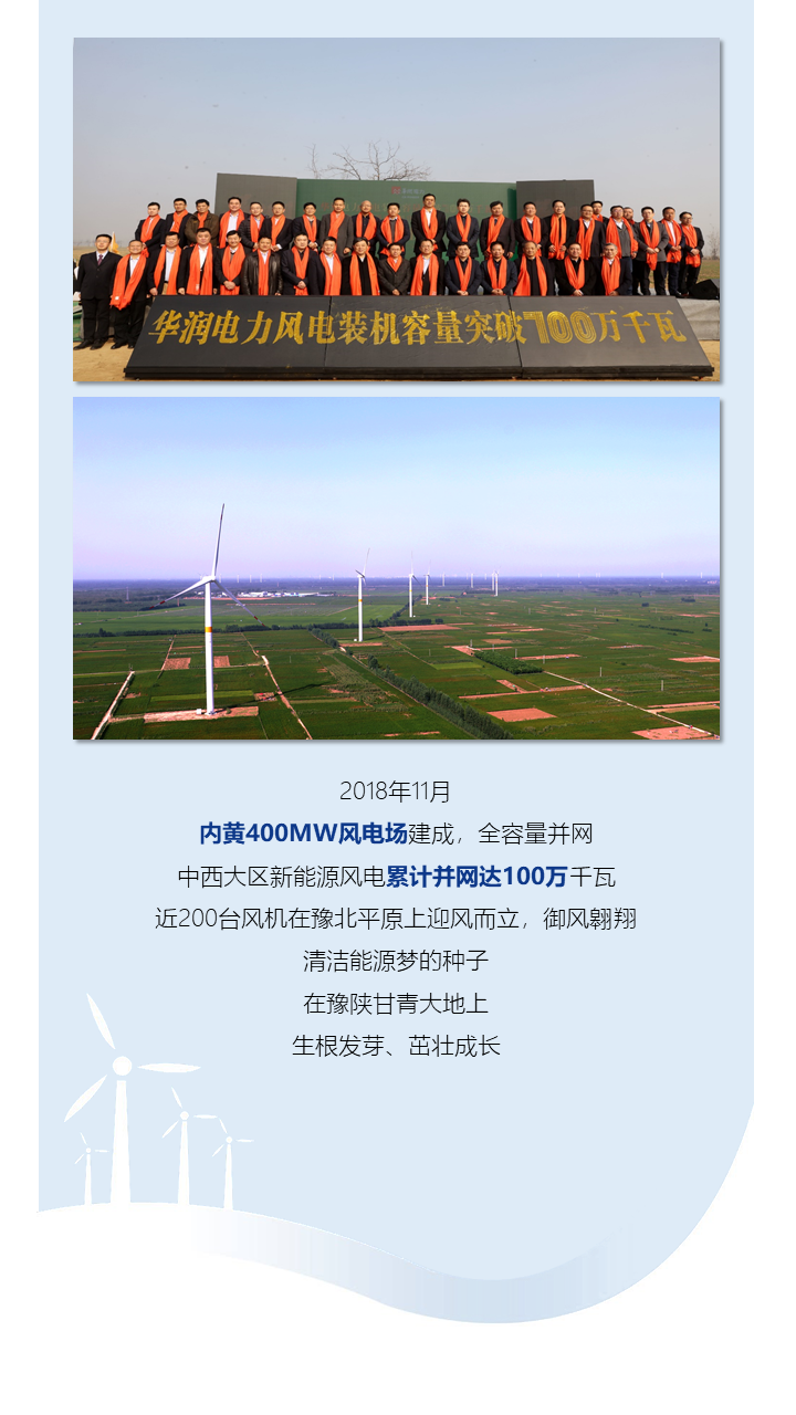 2016年6月,德令哈20MW光伏项目成功并网,大区新能源在青海的发展序幕正式拉开;2017年7月,陕西陇县丰台山一期100MW风电项目首批风机并网,华润电力在陕西省的首个风电项目正式投入商业运行;2018年11月,内黄400MW风电场建成并实现全容量并网,中西大区新能源风电累计并网达100万千瓦,近200台风机在豫北平原迎风而立……