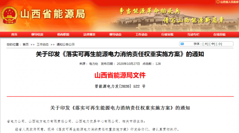 10月27日,山西省能源局印发《落实可再生能源电力消纳责任权重实施方案》的通知,按照国家明确的消纳责任权重,对省内承担消纳责任的各市场主体,明确最低可再生能源电力消纳责任权重,包括可再生能源电力总量消纳责任权重和非水电可再生能源电力消纳责任权重,并按责任权重对市场主体完成情况进行考核,对未完成消纳责任权重的市场主体进行监督落实,并依法依规予以处理。