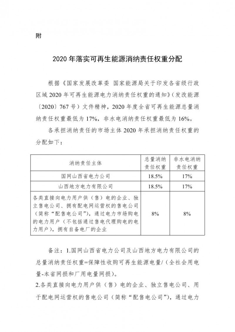 1.国网山西省电力公司、山西地方电力有限公司、增量配电项目试点企业(正式运营),承担与其年售电量相对应的消纳责任权重,按其省内售电量的多少等比例承担保障性收购可再生能源电量(非市场化电量)的责任。