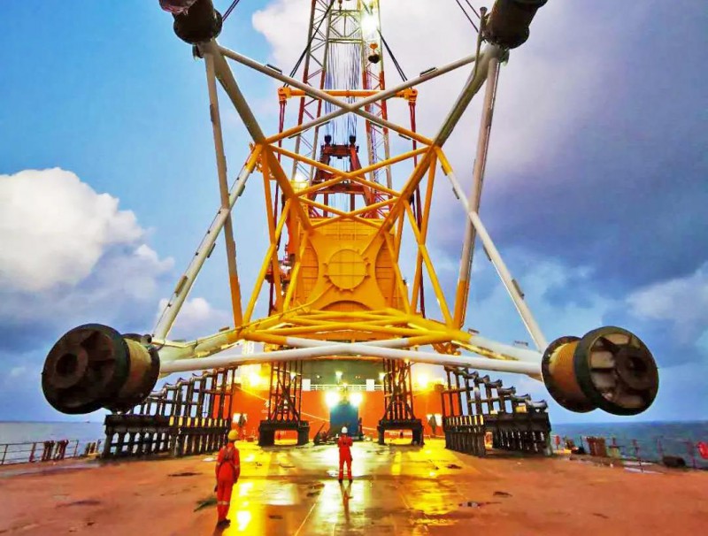 经过几轮优化设计和严格复核,广东院提出的“大直径非嵌岩四桩导管架”概念成为了现实。在入泥深度不足30米的情况下,直径为3.5至5米的钢管桩,成功支撑起了庞大的风机机组。