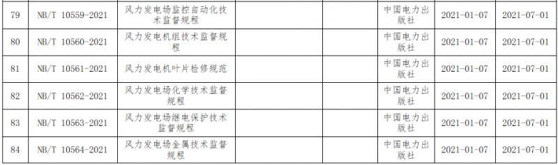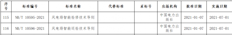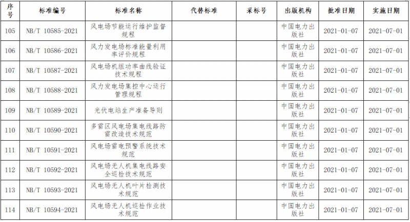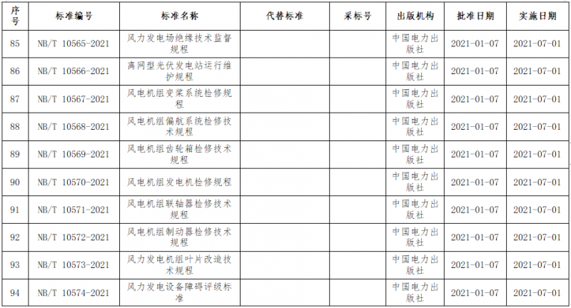 近日,国家能源局批准《风力发电场监控自动化技术监督规程》、《风力发电机叶片检修规范》等113项能源行业标准,其中涉及风电标准37项,2021年7月1日起实施。