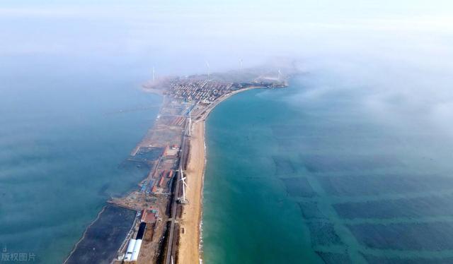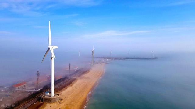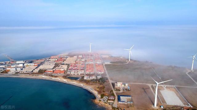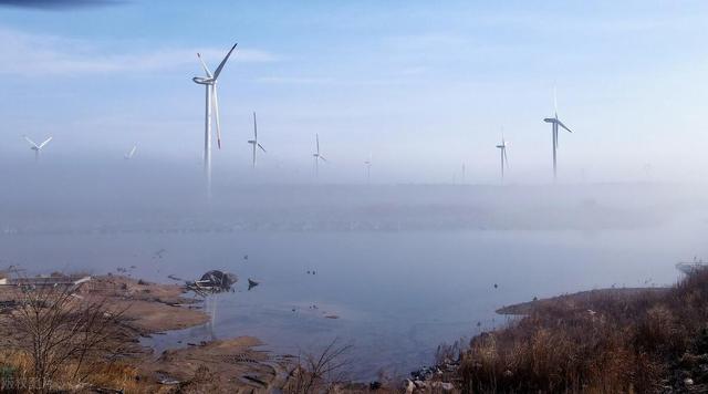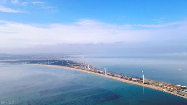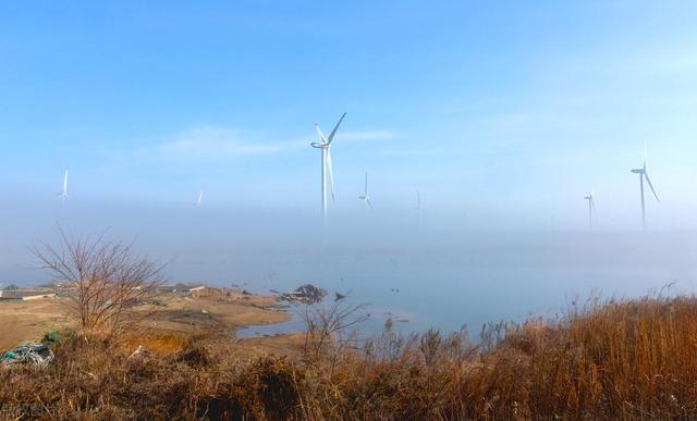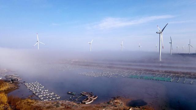 山东荣成石岛管理区东楮岛海岸,海上风电在云雾的笼罩下如梦如幻