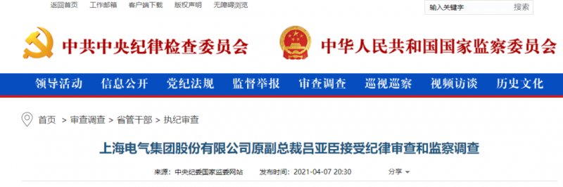 4月7日,中央纪委国家监委网站发布关于上海电气集团股份有限公司原副总裁吕亚臣接受纪律审查和监察调查公告,下附原文:
