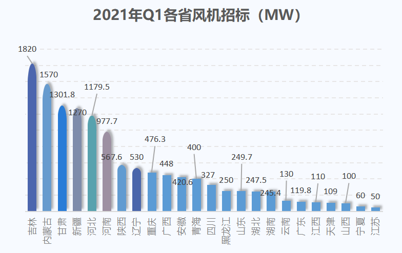 24个省份发布了风机招标。其中,有四省招标容量均超1GW,分别为吉林(1820MW)、内蒙古(1570MW)、甘肃(1301.8MW)、河北(1179.5MW)。
