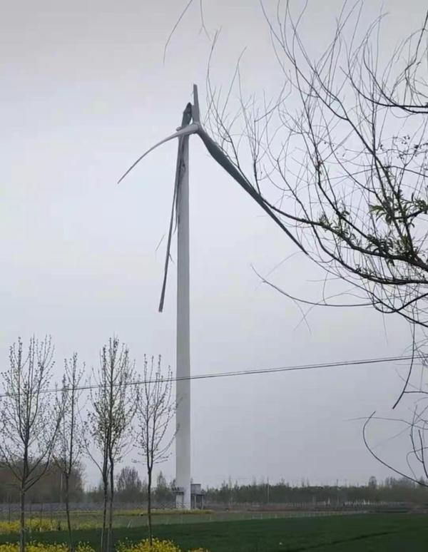 4月2日上午,在长垣市恼里镇小辛庄村北的麦田内,正在运行的风力发电机扇叶突然断裂,有村民拍下了断裂全过程。