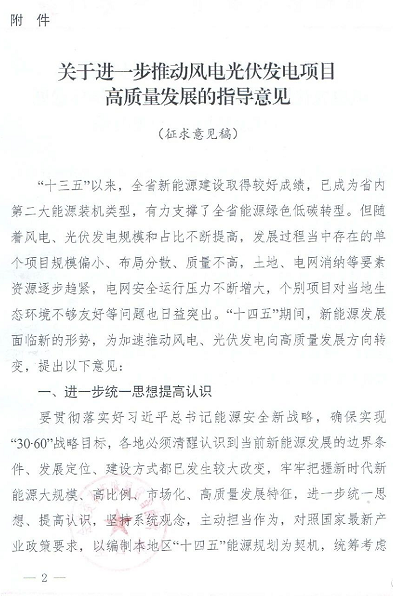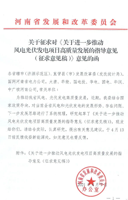近日,河南省发改委发布关于征求对《关于进一步推动风电光伏项目高质量发展的指导意见(征求意见稿)》意见的函。