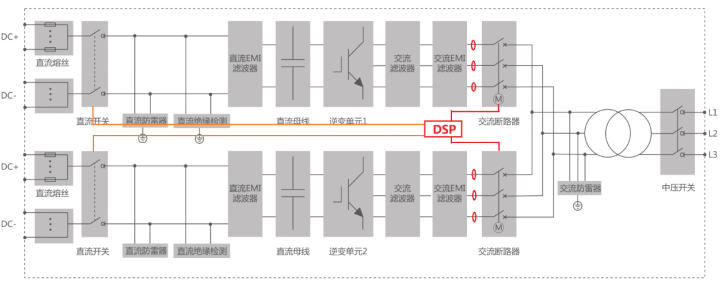举例:当逆变器内部出现电压、电流异常需要保护,或者电网异常等需要逆变器与电网脱离时,所有的电网脱网的动作都是通过DSP控制交流断路器断开;特别的,针对逆变器直流母线短路故障时,需要同时通知交流断路器断开、直流开关断开。