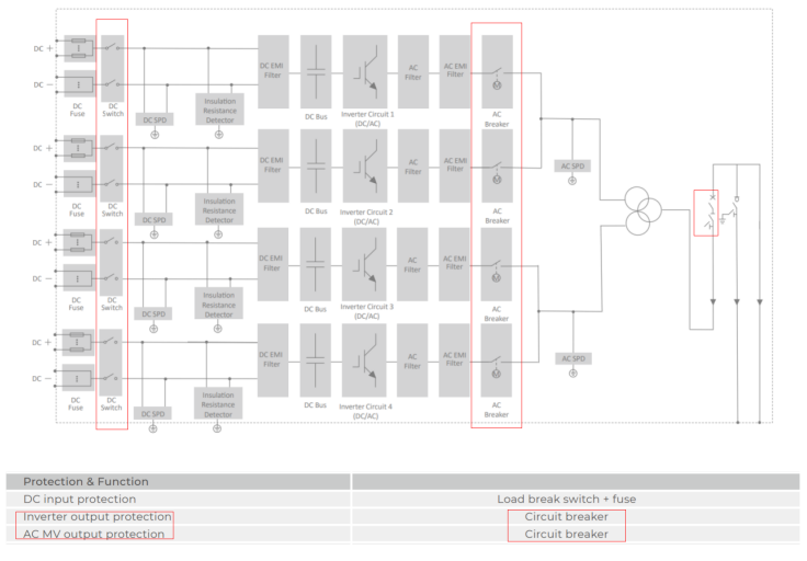 进一步的以该集中式集成一体化方案举例分析,该逆变器对外的DataSheet中的电气框图包括直流输入保护、逆变器输出保护和中压保护。其在输出和中压保护中均使用电子脱扣器开关。