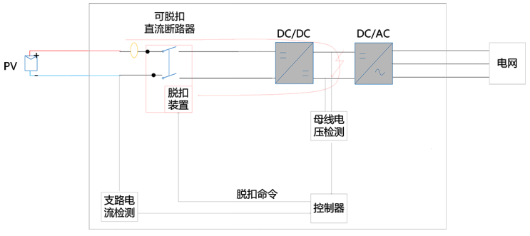 智能直流关断功能的核心是:具有自动分断能力的直流断路器、组串级检测功能的逆变器,如图所示。