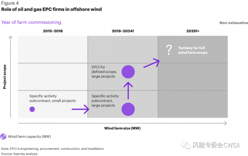 在项目开发方面,传统的油气服务商及EPC参与方正在利用其丰富的海上能力开始向海上风电多元化发展(见图4)。传统上,油气EPC只是作为海上特定项目活动的分包商,很少参与海上风能项目,例如,它们只提供小型风电场基础的安装。但现在,这些EPC也参与到海上风电价值链中,对产业链进行重新定位,可提供更大更复杂的项目服务——从大型风电场的分包合同,到为特定项目提供工程、采购、建设和安装的服务,转身为EPCI角色。将来,一个EPC参与者的角色可能会演变为一揽子交付整个风电场,所谓的交钥匙(turnkey)工程。目前为止,只在亚洲存在这样的先例。