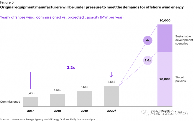 充分发挥海上风电的潜能,就像延伸价值链一样,可能会带来风机生产和物流的瓶颈。第一个问题是,全球风电整机制造商(OEMs)是否有能力扩大生产以满足不断发展的需求。在过去的几年中,全球整机厂商海上风电装机年新增装机容量不到5GW,但到2030年,需求将增长到每年20至30GW(见图5)。这和目前全球的整机商的制造能力和财务状况还有一定的差距。同时,不断增长的海上风电物流需求(如近海船舶,运输和安装船等),可能会导致相关船只的缺口,从而导致船只租用价格的上涨。