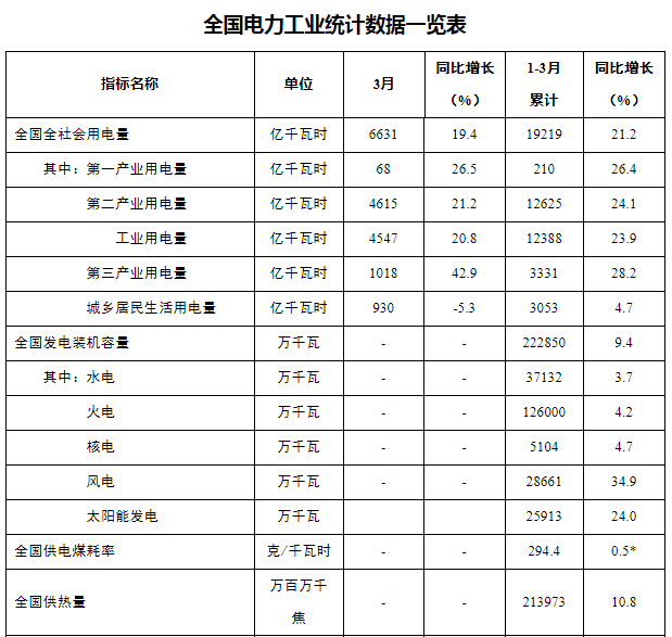 4月20日,国家能源局发布1-3月份全国电力工业统计数据。