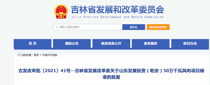 核准信息显示,山东发展投资(长岭)50万千瓦风电项目法人单位为吉鲁(长岭)新能源有限公司,项目建设地点为长岭县。项目总投资411005.74万元,将新建单机容量3.3兆瓦风电机组151台和单机容量1.7兆瓦风电机组1台,配套新建1座220千伏升压站。
