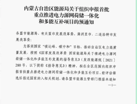 近日,内蒙古自治区能源局发布《关于组织申报首批重点推进电力源网荷储一体化和多能互补项目的预通知》,标志着内蒙古2021首批源网荷储一体化和多能互补项目申报工作启动,根据文件内容,摘要如下: