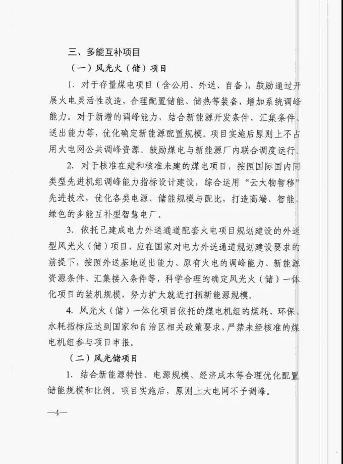 3.多能互补项目分为风光火(储)项目、风光储项目。其中,风光火(储)项目对于存量煤电项目,鼓励通过开展火电灵活性改造,合理配置储能、储热等装备,增加系统调峰能力。对于新增的调峰能力,结合新能源开发条件、汇集条件、送出能力等,优先确定新能源配置规模。