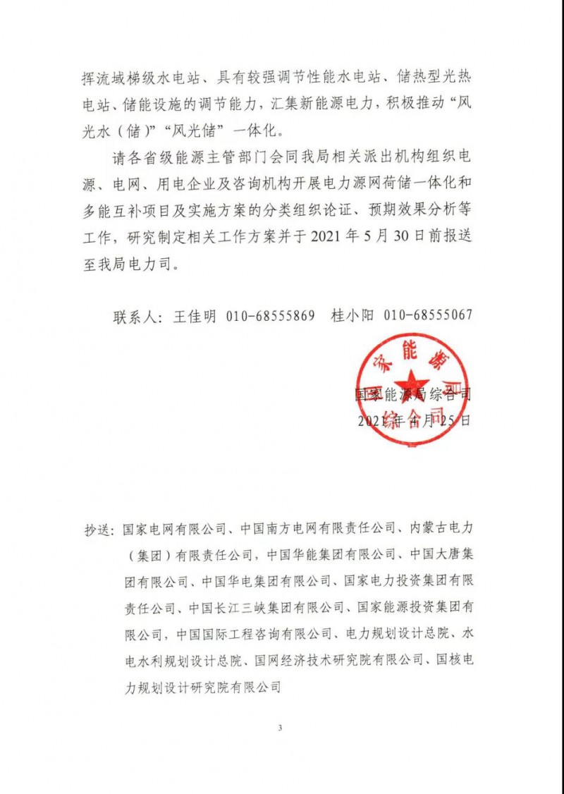 4月25日,国家能源局综合司向各省市发改委及能源局印发《关于报送“十四五”电力源网荷储一体化和多能互补工作方案的通知》,就“碳达峰”、“碳中和”目标下推动电力源网荷储一体化和多能互补发布给出指导意见。