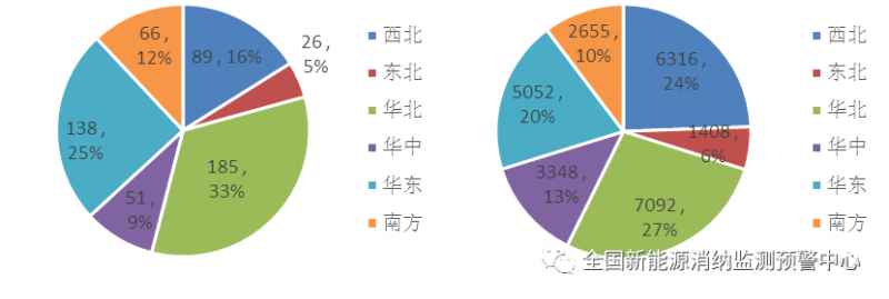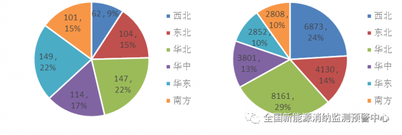 一季度各区域新增(左)、累计(右)并网光伏发电装机(万千瓦)