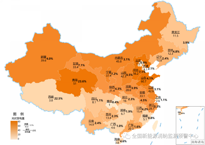 截至3月底各地区累计光伏发电量(亿千瓦时)及占本地区总发电量比重