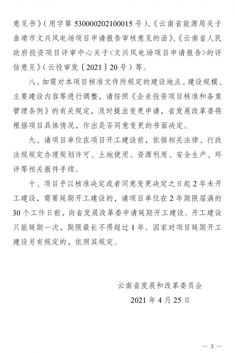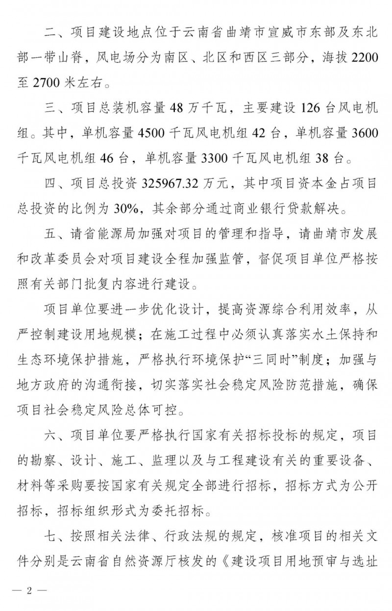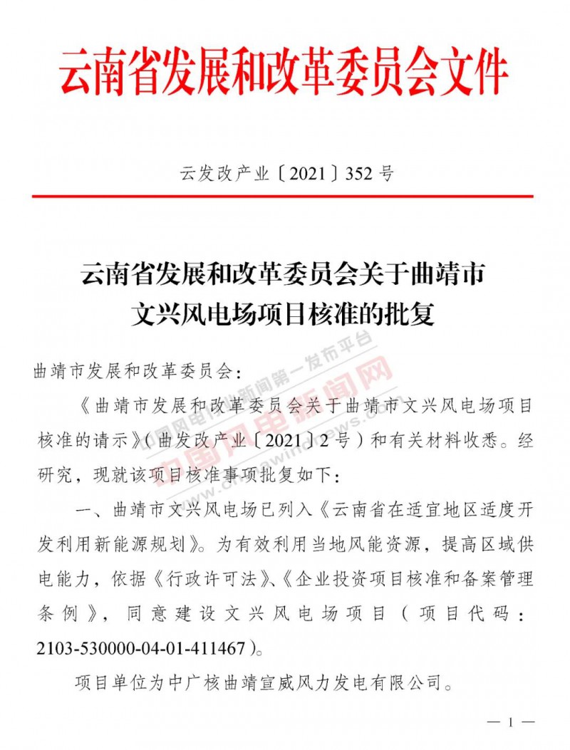 4月25日,云南省发改委核准批复曲靖市文兴风电场项目,项目单位为中广核曲靖宣威风力发电有限公司,项目总装机容量48万千瓦,主要建设126台风电机组。其中,单机容量4500千瓦风电机组42台,单机容量3600千瓦风电机组46台,单机容量3300千瓦风电机组38台。