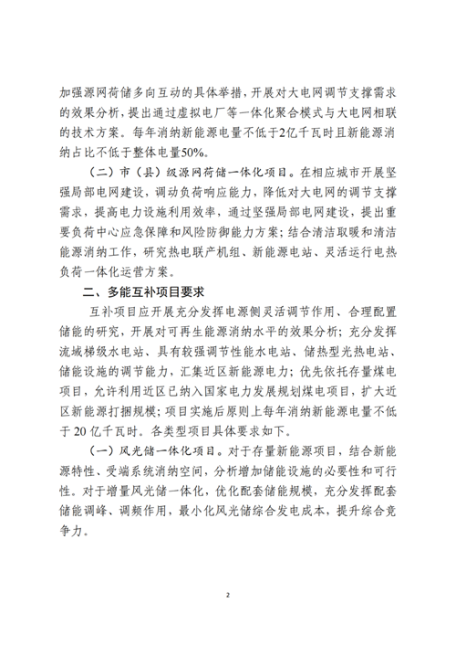 多能互补类项目主要包括风光储一体化,风光水(储)一体化与风光(火)储一体化,要根据存量新能源项目分析储能设施增加的必要性和可行性,最小化风光储综合发电成本。风光水(储)鼓励龙头电站建设优化出力特性,实现就近打捆,增量项目要严控中小型水电建设规模,以大型水电为基础。风光火(储)要严控新增煤电需求,对于增量就地开发消纳项目,优选利用新能源电力。