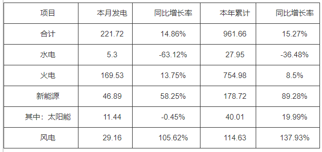 (一)发电量情况。4月份当月,全省发电量221.72亿千瓦时,同比增加14.86%。其中水电5.3亿千瓦时,同比减少63.12%;火电169.53亿千瓦时,同比增加13.75%;新能源46.89亿千瓦时,同比增长58.25%。
