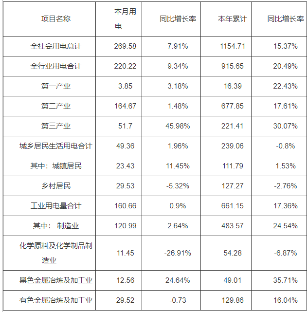 (一)全社会用电量情况。全省全社会用电量269.58亿千瓦时,同比增加7.91%;累计用电量1154.71亿千瓦时,同比增加15.37%。