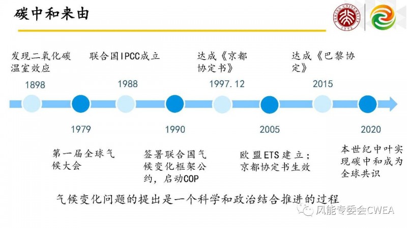首先给大家介绍一下碳中和的背景。不少人觉得碳中和好像是近一年来的一个新事物,实际上它有非常深厚的传承,也经历了一个长期复杂的政治谈判磋商历程。从1990年中国正式作为缔约方签署了《联合国气候变化框架公约》开始,我国一直是应对气候变化的积极参与者。其中一个重要的节点是2015年中国作为主要推动方签订了《巴黎协定》。在《巴黎协定》框架下,通过国家自主贡献,要实现把温升控制在2摄氏度,力争达到1.5摄氏度的目标。2018年,联合国应对气候变化委员会对目标作出了评估,认为如果想要把温升控制在1.5度,到2050年就应该实现近零排放。