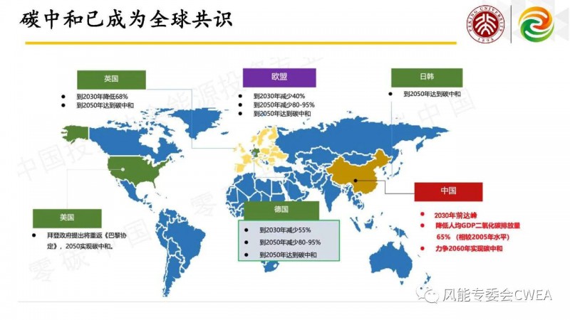 也就是说,3年前的时候我们就已经形成了一个科学的共识。到去年,我们国家正式宣布碳中和目标,全球范围已经形成了共识。我在这里也想跟大家介绍一下,在1990年缔约的时候,中国累计排放了全球大概7%的二氧化碳, 30年过去,我们已经是全球第一大二氧化碳排放国,是美国加上欧盟甚至要加上日本的总和,中国的累计排放量也达到17%,人均累计排放基本上是全球平均水平。在共同但有区别的原则下,承担大国的担当和责任,这是构建人类命运共同体的应有之义。我们可以看到,GDP占全球70%以上的主要经济体已经宣布了碳中和,大多数计划到本世纪中叶实现碳中和,最早的像挪威等国2030年就要实现碳中和。