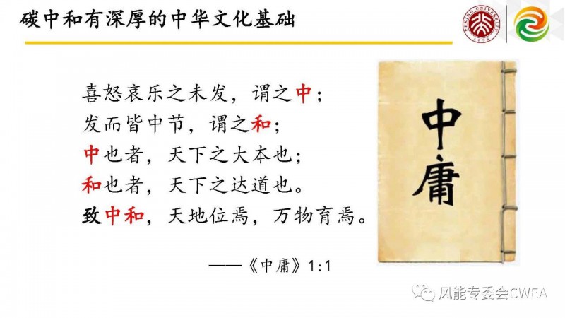 碳中和有深厚的中华文化基础。《中庸》第一章第一节中就说到了中和,这是中华民族非常美好的字眼,我曾经向北大哲学老师请教,如果用四个字来概况我们中华文化,就是“阴阳中和”。“中和”原文是分开来表述的,借用一下原义,如果我们能够用低碳,不排放,那就是“中”,如果我们排了之后,能够把它处理掉,那就是“和”,所以“致中和,天地位焉,万物育焉”,这是非常美好的愿望。建设生态文明、可持续发展,中华文明永续发展是一脉相承的。