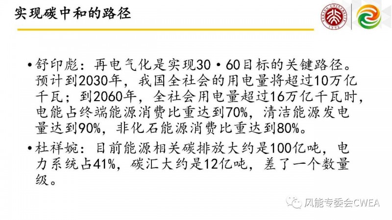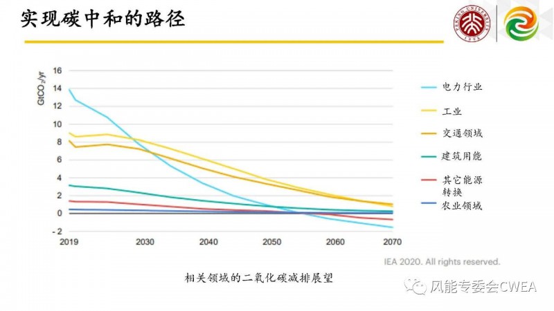 在IEA发布的相关领域二氧化碳减排展望图中,我们可以看到,首当其冲的是电力,全球的情况跟中国也基本吻合,电力的排放目前占到总排放量的40%以上,在中国要更高一些。如何实现电力的减碳,这是一个非常现实的问题,图中,蓝线下降得比较快,比起工业,如炼钢、航空燃油等不容易减少碳排放的领域,电力行业更有条件率先实现低碳发展,这也是作为最大的二氧化碳排放来源的任务,比如通过风电、光伏等低碳电力的大规模发展,电力行业应该率先实现达峰与中和。