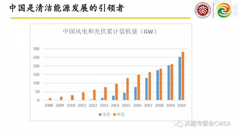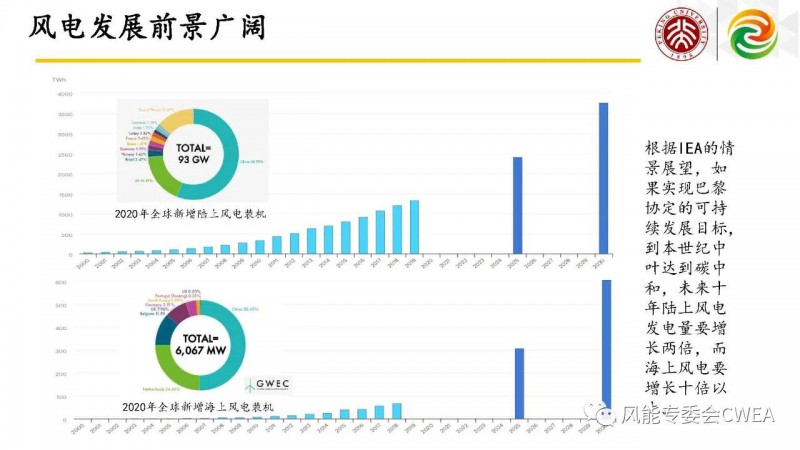 风电发展前景广阔。2020年全球陆上风电装机93GW,海上风电装机6GW,总装机接近1亿千瓦(100GW),其中,中国在陆上和海上方面都超过了一半多。据国家能源局发布的数据,2020年中国风电并网装机超过7000万千瓦。根据IEA的情景展望,如要实现《巴黎协定》可持续发展的目标,到本世纪中叶实现碳中和,未来十年陆上风电的发电量要增长2倍以上,而海上风电要增长10倍。所以说,风电具有巨大的发展潜力。