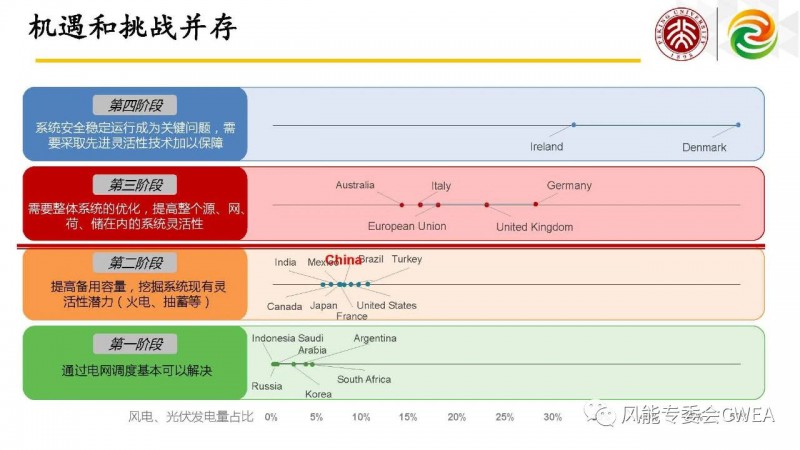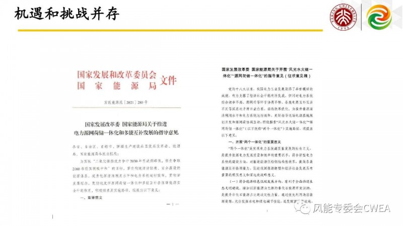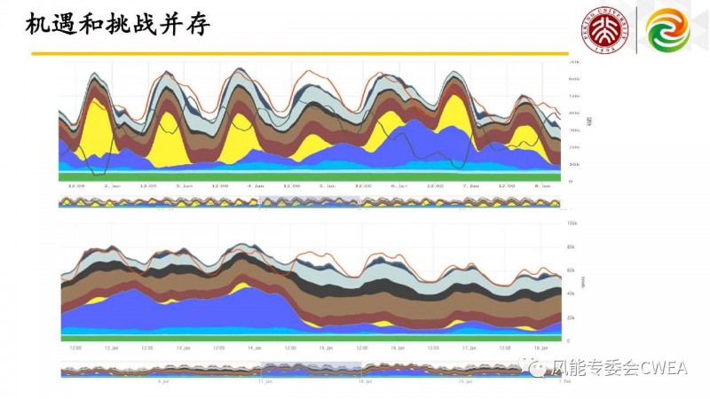 我们提出“风电光伏到2030年要实现12亿千瓦以上装机。”这是一个重大的机遇,也面临着巨大的挑战。第九届中央财经委员会上提出来“新型电力系统”的概念,要求以新能源为主体。建设新型电力系统,有点像摸着石头过河,我们自己的石头也快摸完了,不知道什么是新型电力系统。我简单分享一个德国的电力系统出力的图给大家:我们可以从图上看到,黄色的面积是光伏,白天很高,到了晚上就没有了,跨季节差异也非常大(下面的是冬天)。风电是深蓝色的,我们可以看到有时风比较大,可以占到一半以上的风电量,但有时候很少。如何保持电力系统的稳定和安全,这是一个特别大的挑战,大家应该都能感受到并网的问题一直是一个非常大的挑战。