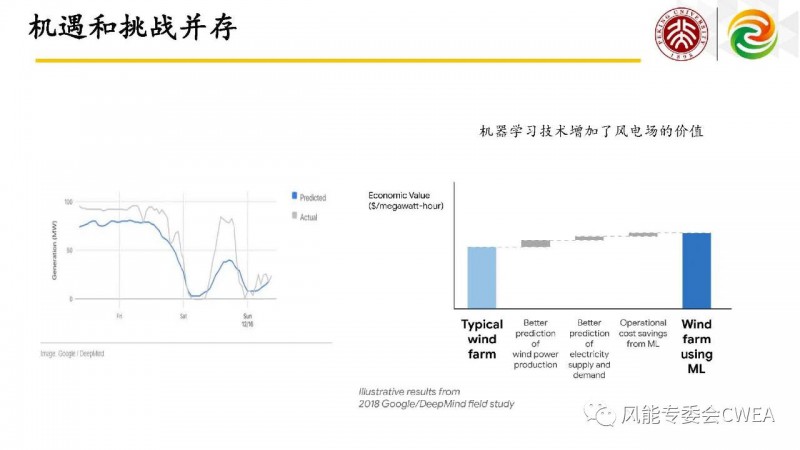 但我们也不能一味地等着政策完善了再行动。随着补贴的退出或者平价上网时代的到来,更多应该从行业自身来创新,挖掘发展空间。这里给大家讲一个例子,开发阿尔法Go把围棋冠军打败的的公司,它在做风电预测,通过机器学习(ML)技术,可以增加风电场的价值。通过机器学习不断的进行匹配,后面可以看到风场的价值在不断的提升,据说提升了20%以上。通过大数据的技术,把原来认为是不可调度的风电和光伏,通过很好的提前预测从而变得更加电网友好,这都是非常大的进展,我觉得这个会为未来的商业模式和市场提供更多的条件。