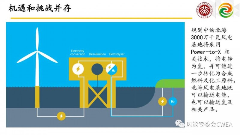 这里也给大家展示一个例子:这是规划中的北海3000万千瓦风电基地其中的一个概念模型,该工程不仅会构建一个输电网络,也会构建一个输氢的网络,还包括像氨这样的氢相关产品,通过Power-to-X相关技术会有更多的可能性。据了解欧洲在做氢传输管网的规划,到2040年,大概要建设2万多公里的输氢网络,基本上可跟天然气网络相提并论。这里也希望北海这个项目,能给大家一点启发,在未来的技术创新和商业模式创新方面,我们应该有更广阔的空间。