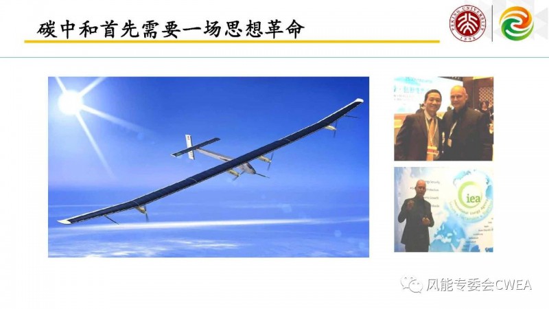 最后我再给大家讲一个多次讲过的故事。他叫波兰特·皮卡,创造了一个人类的壮举,驾驶太阳能飞机第一次环行世界,他说带给我们最重要的信息就是人类不用化石能源也可以实现环球航行。我很荣幸在欧洲跟他做过多次交流,他说自己不是搞能源的,也不是搞航空的,只是个有着冒险世家传统的心理学家。他说自己做太阳能飞机的时候,波音等公司不愿意替他制作飞机,怕失败了影响声誉,后来他就找了碳纤维的造船厂造了飞机,他说在天上遇到的困难肯定比地上多,但他这样一个外行都能实现靠新能源环球旅行,为什么呢?是因为他没有行业里那些思想的框限,这些相关的技术都已经有了,我们要做的,就是要首先打破思维的框限。我把这句话也送给大家,用我们习惯的话说,就是:碳中和首先需要的是一场思想革命。