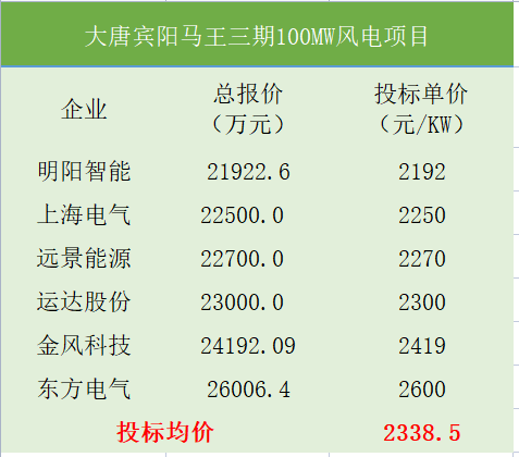 大唐宾阳马王三期项目风机招标开标结果再创记录:明阳报出2192元/KW价格,刷新大唐文山风电项目2254元/KW最低报价。