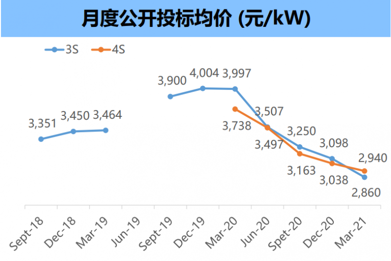 从金风科技公布的信息,2021年3月,3S级别机组的投标均价为2860元/千瓦、4S级别机组投标均价为2940元/千瓦。肉眼可见的,进入4月后,大唐、华能等为主的几个大项目的风机投标均价都已经下降到2400元/KW左右。