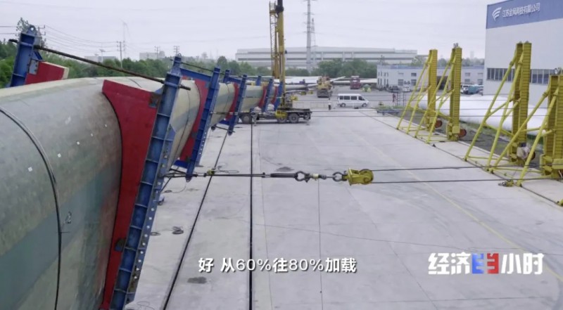 五台自动化静力加载设备通过钢丝绳与叶片上的夹具相连,他们将模拟自然界的台风考验叶片。力量逐渐加大,直到100%,叶片依然没有折断,完美通过测试。