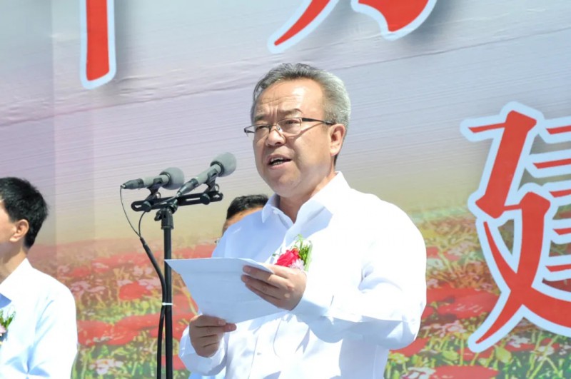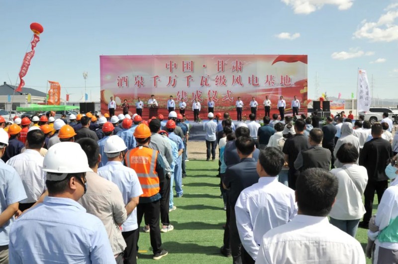 酒泉市委书记吴仰东在建成仪式上讲话,并宣布酒泉千万千瓦级风电基地建成。