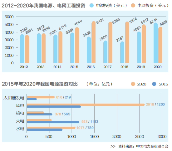 根据中国电力企业联合会统计,2020年全国电力总投资达9943亿元,同比增长9.6%,其中电源投资5244亿元,电网投资4699亿元,分别占电力总投资的52.7%、47.3%。过去十年来,中国电力投资总体呈增长态势,“十二五”“十三五”期间年均投资分别为7800亿元、8800亿元,其中电力投资的结构也出现较大变化。