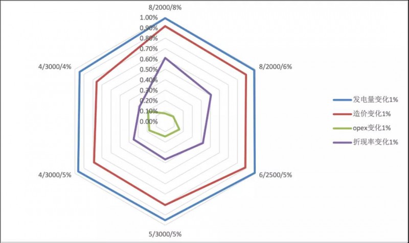 如前所述,LCOE有四大影响要素。从敏感度(指要素变化1%LCOE变化多少百分比)来看,发电量和造价确实是影响最大的。不同方案组合下,发电量变化1%LCOE变化0.9%-1%,造价变化1%LCOE变化0.8%-0.9%。