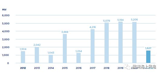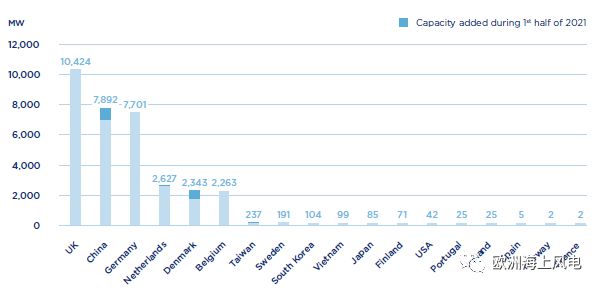 根据世界海上风电论坛(WFO)发布的《2021年半年度全球海上风电报告》,受疫情等原因影响,2021年上半年全球仅新增装机1.6GW,增速明显放缓。
