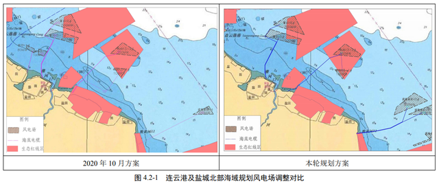 另外根据江苏省海洋主体功能规划分析,各区域送出海缆也尽可能绕避了各类生态 敏感区,但受限于近岸海域人类开发利用活动和生态保护要求,在规划阶段仍有少部分 送出海缆的规划路线穿越海洋自然保护区实验区,与海洋主体功能区规划中的禁止开发 区域管制要求存在不协调。下阶段规划中具体项目在实施前,需进一步协调单个风电场 与海洋主体功能规划和生态红线的关系,确保与上述规划及管控要求符合后方可实施。