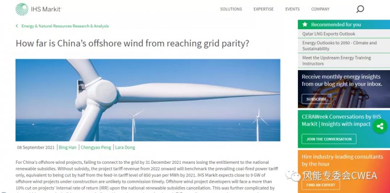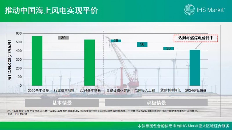 为能源及自然资源产业链相关产业和市场提供专业数据,软件以及咨询和研究分析服务的埃信华迈(IHS Markit )近期发表的文章《中国海上风电离平价还有多远?》(How far is China’s offshore wind from reaching grid parity?) 显示,按照“积极情景”中的定义,中国海上海上风电成本总共可节约高达120元/兆瓦时,从而将全国范围内的海上风电平价时间表提早到2024年。