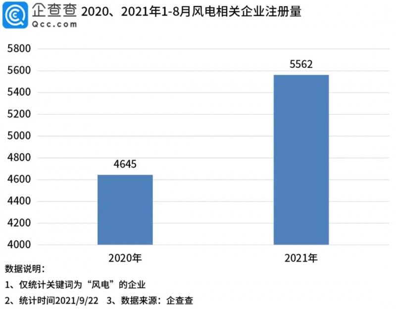 企查查数据显示,目前全国范围内共有5万家风电相关企业,其中江苏省以5515家相关企业排名第一,广东省、山东省分列二三名。城市分布上,深圳市、西安和广州市位列前三。从注册量上看,2020年注册量7846家,同比增长15%。2021年前8个月共新增5562家相关企业,同比增长20%。