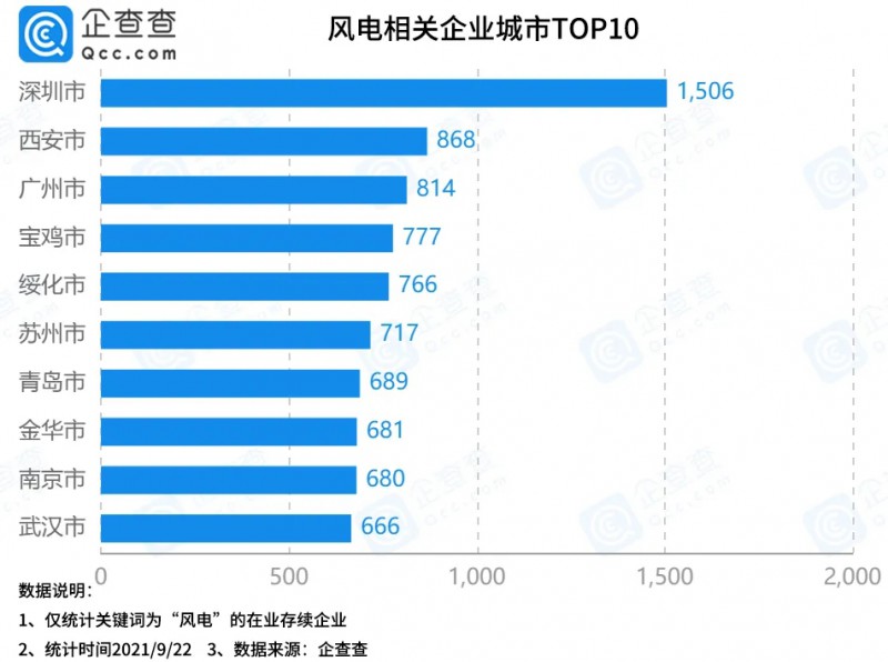 企查查数据显示,深圳市风电相关企业数量最多,达1506家,占广东省总量的27%。西安市、广州市分别以868家和814家位列二三位。